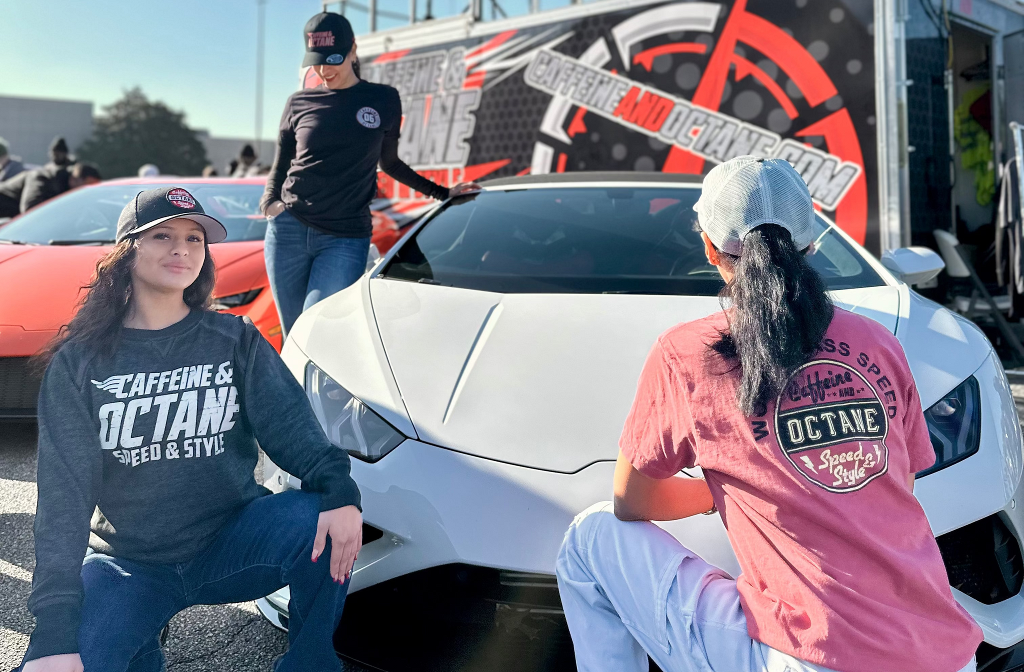 • Two people wearing hoodies with visible caffeine and octane branding in front of a branded backdrop. cars and coffee